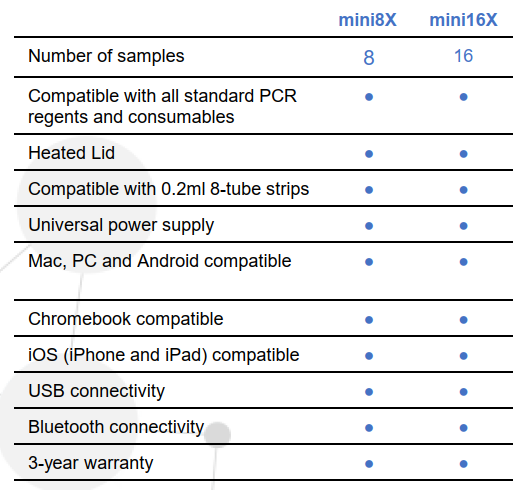 ● mini16X thermal cycler,16 wells,在相同佔地面積下提供兩倍容量。無線連接功能,並通過Flex近乎無限的編程選項,包括接觸式PCR。